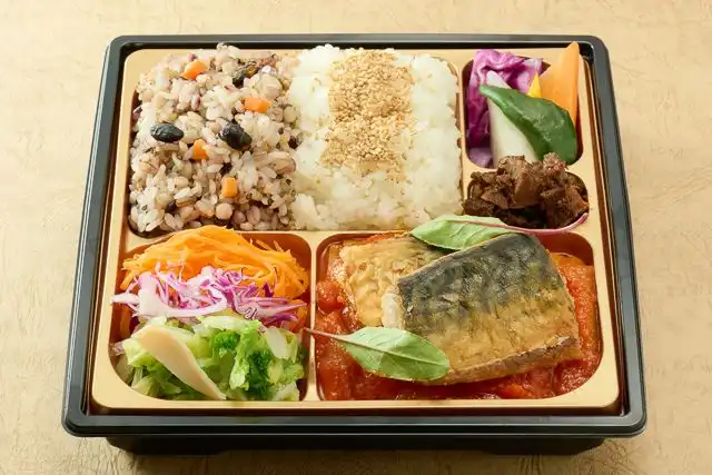 十六穀米170g / 鯖のポワレバスク風 / バーニャカウダー / 牛肉のラグー / キャロットラペ / 紫キャベツ / 白菜のソテー