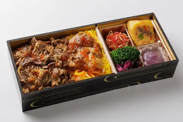 ご飯(180g)、牛バラ焼き、鶏の照り焼き、錦糸玉子、とびっこ、卵焼き、イカカラフルボール、水菓子、ブロッコリー、しば漬け