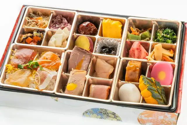 【ご飯】海鮮チラシ120g【おかず】木の葉南瓜、煮物、チキンロール 、ローストビーフ、ローストポーク、カジキスモーク、鴨ロースト、ほうれん草のナムル、出し巻き、さつまいも、ミートボール、煮豆、花かまぼこ、季節の炊き合わせ、季節の副菜