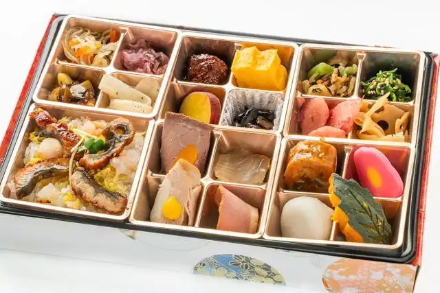 【ご飯】鰻と海老のチラシ寿司120g【おかず】木の葉南瓜、煮物、チキンロール 、ローストビーフ、ローストポーク、カジキスモーク、鴨ロースト、ほうれん草のナムル、出し巻き、さつまいも、ミートボール、煮豆、花かまぼこ、季節の炊き合わせ、季節の副菜