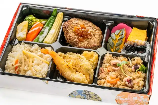 【ごはん】海鮮炊き込みごはん120g、炊き込みご飯120g【おかず】天ぷら、グリルハンバーグ、季節の野菜、木の葉南瓜、出し巻き、煮豆、花かまぼこ