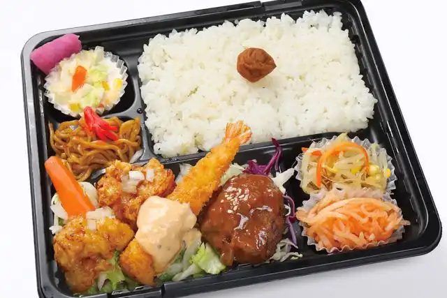 ユーリンチ、ジューシーなハンバーグ、エビフライと和・洋・中の人気なおかずを一度に楽しめるお弁当です。