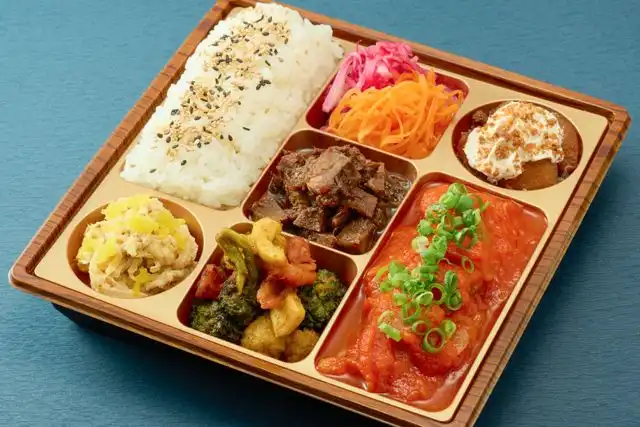白米(180g) / 鶏もも肉と野菜のトマト煮込み / 牛赤ワイン煮 / 切り干し大根とツナのサラダ / キャロットラペ / シュールージュ / ブロッコリーとカリフラワーと海鮮のスパイスソテー / リンゴシュトゥルーゼル