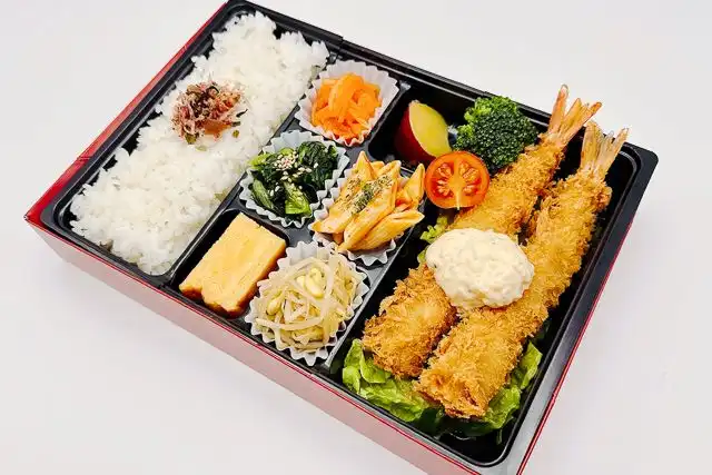 大海老フライのお弁当です。栄養のバランスに考慮し、多くのおかずで楽しんで頂ける様に色とりどりの食材で見た目にも体にも優しく嬉しい内容を心掛けました。