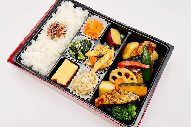 さば竜田揚げと野菜を黒酢で和えたお弁当です。栄養のバランスに考慮し、多くのおかずで楽しんで頂ける様に色とりどりの食材で見た目にも体にも優しく嬉しい内容を心掛けました。