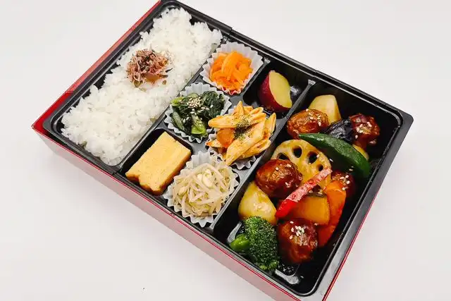 肉団子と野菜を黒酢で和えたお弁当です。栄養のバランスに考慮し、多くのおかずで楽しんで頂ける様に色とりどりの食材で見た目にも体にも優しく嬉しい内容を心掛けました。