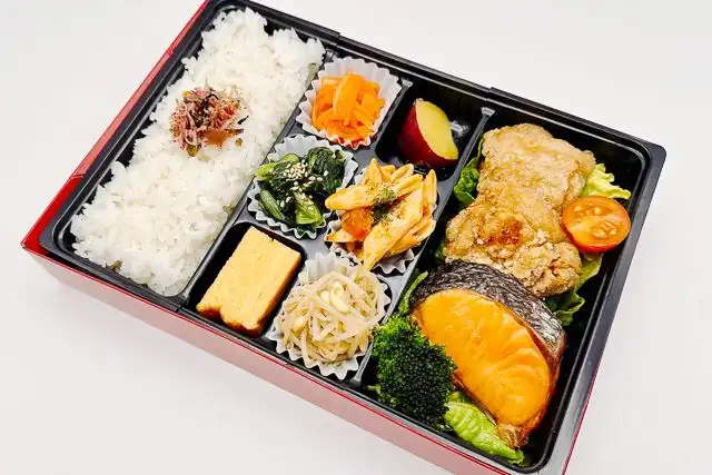 人気のおかず鮭の塩焼きと唐揚げのコンビ弁当です。栄養のバランスに考慮し、多くのおかずで楽しんで頂ける様に色とりどりの食材で見た目にも体にも優しく嬉しい内容を心掛けました。