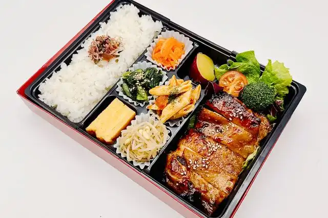 自家製のタレで漬け込んだ鶏もも肉の炙り焼き弁当です。栄養のバランスに考慮し、多くのおかずで楽しんで頂ける様に色とりどりの食材で見た目にも体にも優しく嬉しい内容を心掛けました。