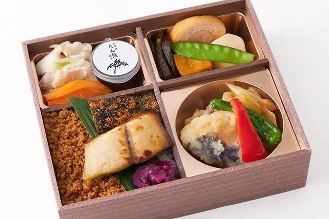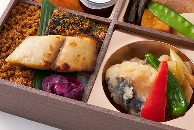 【ごはん】ご飯160g(鰹昆布、しば漬け)【おかず】鰆の西京焼き、南蛮漬け、豚しゃぶ(特製ポン酢)、煮物(なごみ巻、六角里芋煮、あわ麩、きゃらぶき煮、絹さや