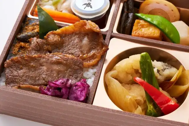 【ごはん】ご飯160g(鰹昆布、しば漬け)【おかず】牛焼肉(醤油だれ)、南蛮漬け、豚しゃぶ(特製ポン酢)、煮物(なごみ巻、六角里芋煮、あわ麩、きゃらぶき煮、絹さや)