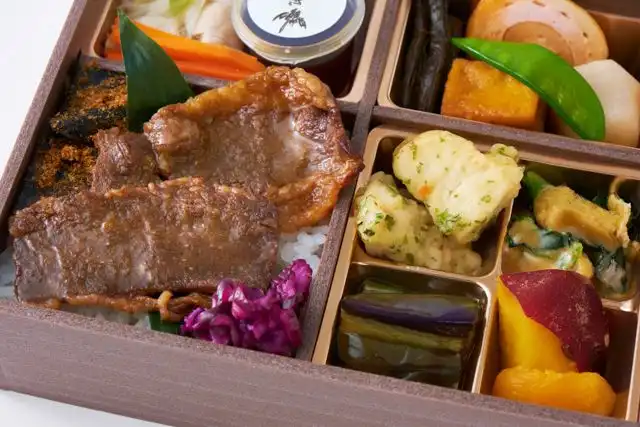 【ごはん】ご飯160g(鰹昆布、しば漬け)【おかず】牛焼肉(醤油だれ)、豚しゃぶ(特製ポン酢)、煮物(なごみ巻、六角里芋煮、あわ麩、きゃらぶき煮、絹さや)、五目豆腐のあおさ揚げ、青菜の煮浸し(ごまだれ)、茄子のオランダ煮、栂ノ尾煮、あんず甘煮