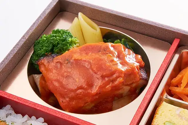 トマトの旨味を生かし柔らかく仕上げたチキンカチャトーラをメインに、旨味たっぷりのえびのオーロラソースやオリジナルのイタリアンオムレツなどバランスの取れた彩り豊かなお弁当です。ご飯にトッピングされた肉味噌は食感のアクセントに蓮根を加え、赤味噌と赤酢で風味良く仕上げました。神保シェフのおもてなしの思いが詰まったお弁当を是非ご賞味ください。