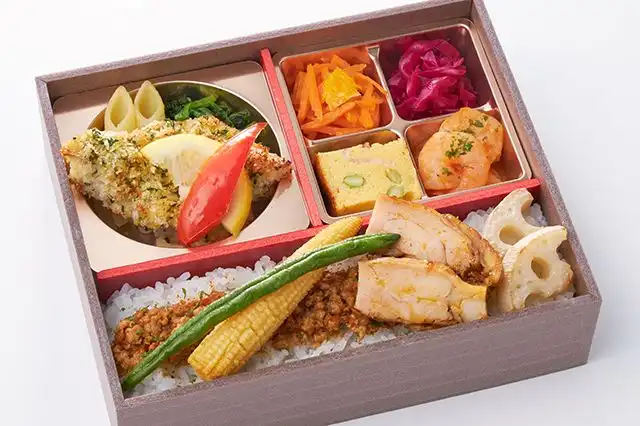 しっとり香り高く仕上げた魚のオーブン焼きをメインに、旨味たっぷりのえびのオーロラソースやオリジナルのイタリアンオムレツなどバランスの取れた彩り豊かなお弁当です。ご飯にトッピングされた肉味噌は食感のアクセントに蓮根を加え、赤味噌と赤酢で風味良く仕上げました。神保シェフのおもてなしの思いが詰まったお弁当を是非ご賞味ください。