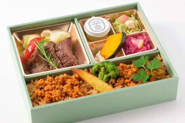 大和橘(やまとたちばな)は、かつて日本に自生していた直径3㎝ほどの小さな実で、「古事記」「万葉集」にも登場するほど古くから存在する、日本固有種の柑橘の原種です。このお弁当には大和橘の果皮をふんだんに使用した「大和橘こしょう」をソースに使用しました。蓋を開けた途端、大和橘の爽やかな香りに包まれます。柚子などとも違う唯一無二の香りをお楽しみください。