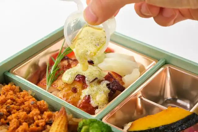 大和橘(やまとたちばな)は、かつて日本に自生していた直径3㎝ほどの小さな実で、「古事記」「万葉集」にも登場するほど古くから存在する、日本固有種の柑橘の原種です。このお弁当には大和橘の果皮をふんだんに使用した「大和橘こしょう」をソースに使用しました。蓋を開けた途端、大和橘の爽やかな香りに包まれます。柚子などとも違う唯一無二の香りをお楽しみください。