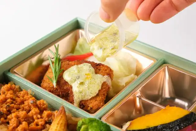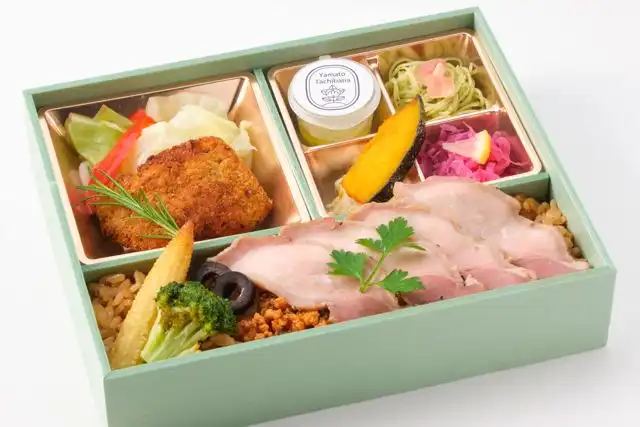 大和橘(やまとたちばな)は、かつて日本に自生していた直径3㎝ほどの小さな実で、「古事記」「万葉集」にも登場するほど古くから存在する、日本固有種の柑橘の原種です。このお弁当には大和橘の果皮をふんだんに使用した「大和橘こしょう」をソースに使用しました。蓋を開けた途端、大和橘の爽やかな香りに包まれます。柚子などとも違う唯一無二の香りをお楽しみください。