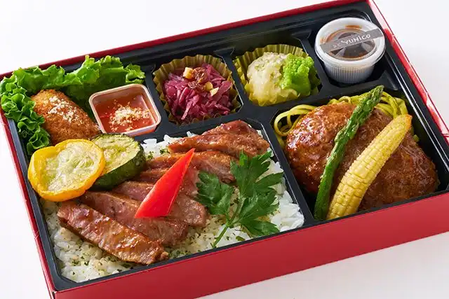 贅沢な味わいが楽しめる特別なお弁当をお届けします。ハンバーグとステーキのダブルメインは、肉好きにはたまらない組み合わせです。ジューシーなハンバーグと柔らかいステーキ、シャリアピンソースのリッチな味わいが、贅沢なひとときを演出します。YUNiCOのエッセンスをちりばめた彩り豊かなサイドディッシュと共に、特別なひとときをお楽しみください。