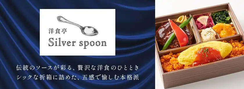 【大切なおもてなしに、銀のスプーンが贈る上質なひとときを】 ビジネスの重要な会議や接待にふさわしい、気品ある洋食御膳。 ふっくら焼き上げたハンバーグや牛ステーキを、ポルチーニ茸や完熟トマトなど、素材の個性を活かした4種のソースが彩ります。 容器には重厚感のあるシックな折箱を採用。蓋を開けた瞬間に広がる芳醇な香りと、洋風ふりかけご飯やオムライスの華やかさが、場を和やかに演出します。細部までこだわり抜いた職人の技を、ぜひ皆様でお楽しみください。