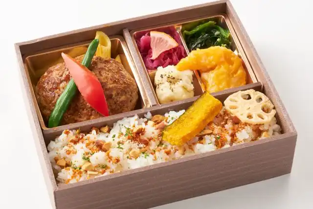じっくり炒めた玉ねぎの甘みと醤油の香ばしさが、肉汁溢れるハンバーグに重なります。素材本来の持ち味を活かした奥行きのある和風の味わいが、ふっくらと炊き上げた白米の美味しさを引き立てる一箱です。