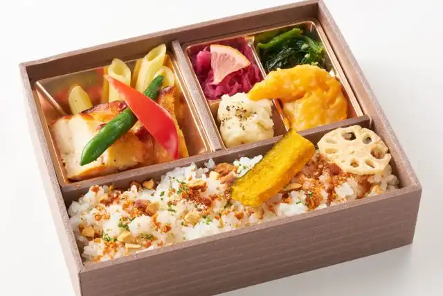 白米220g/燻製ベーコンとナッツの 洋風ふりかけ/チキンステーキ 特製シャリアピンソース /紫キャベツのシトラスマリネ/パルメザンとマスタードを練り込んだ 贅沢ポテトピュレ/海老フリッターマヨネーズソース/ほうれん草のアーリオオーリオ