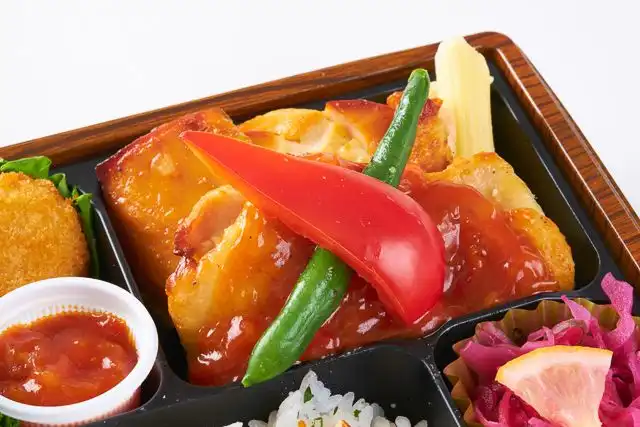 ジューシーなチキンステーキを、具だくさんの野菜ソースで彩りよく。蟹クリームコロッケや紫キャベツのラペが並ぶ華やかな見た目は、和やかなランチ会にもぴったり。上品さと満足感を両立させた一箱です。