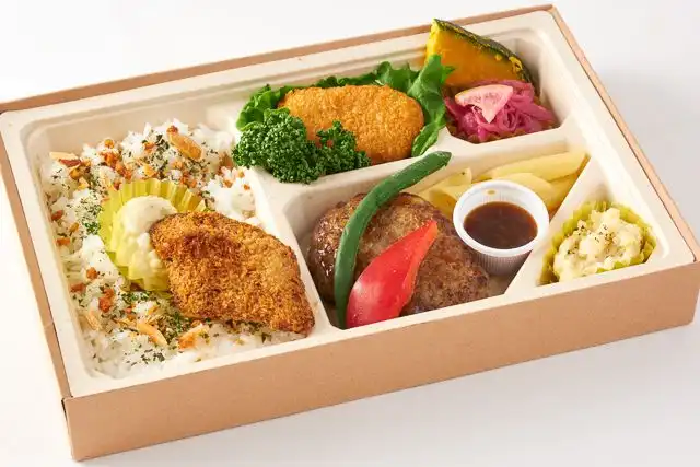 彩り豊かな4種のソースで味わう本格洋食弁当。肉厚なハンバーグやオムライスを、パレットから色を選ぶような楽しさでお届けします。