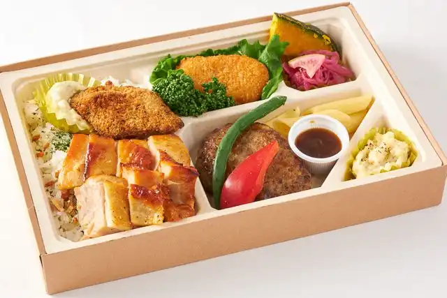 ダブルチキンステーキにハンバーグ、さらに白身魚まで加えた、当店最高峰の満足度を誇るお弁当です。多彩なおかずと4種の選べるソースで、本格的な洋食フルコースのような贅沢なひとときをご堪能ください。