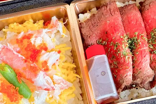 程よい脂身の赤身肉をしっとり、ジューシーに焼き上げたローストビーフのお弁当です。柚子おろしのソースが相性抜群です。また贅沢に彩られた蟹ちらしも絶品。たっぷりの冬野菜とともにお楽しみください。