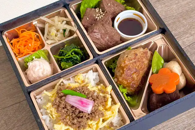 ごはん130g/厚切りはらみ、ハンバーグ、ナムル、炊き合わせ、錦糸卵、そぼろ、ポテトサラダ