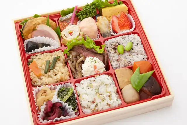 牛ももローストしめじソテー、ポテトサラダ、豆腐ハンバーグ、合鴨スモーク、一口昆布巻、焼鮭、ポークピーマンロール、えびしんじょ、はじかみ、玉子焼き、山芋磯部揚げ、醤油、イチゴ、きんぴら蓮根、小松菜ごま和え、つけ物、うま煮(こんにゃく、里芋、人参、椎茸、絹さや)、レタス、パセリ