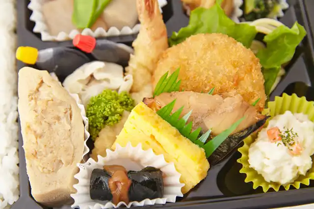 高野豆腐いんろう煮、一口昆布巻、えびの天ぷら、玉子焼き、しゅうまい、ポテトサラダ、えびかつ、小松菜ごま和え、きんぴられんこん、スパゲッティ、レタス、漬物、醤油、ソース