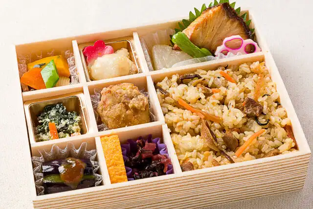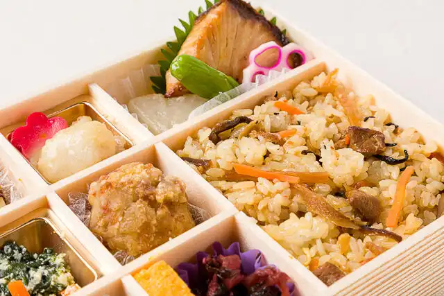 五目ご飯200ℊ/ぶり照り焼き/大根煮/しし唐/花散らし蓮根/フグと豆腐の霙餡かけ/梅麩/煮物/京風白和え/鶏の柚子胡椒風味揚げ/卵焼き/お漬物/茄子田楽