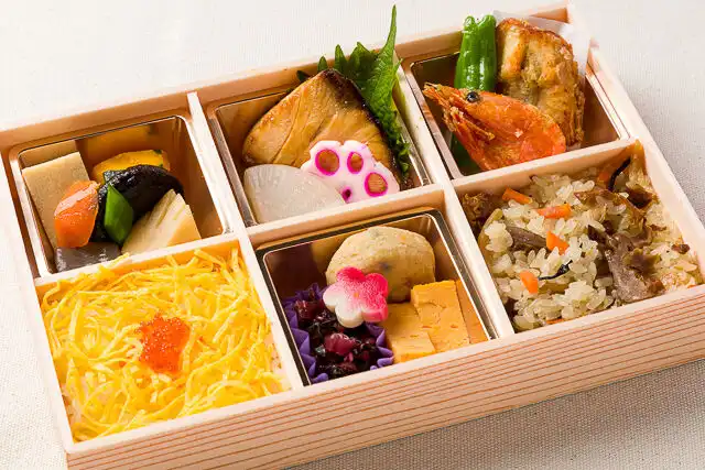 とびこご飯130g/五目ご飯130g/煮物/ブリの照り焼き/大根煮/花散らし蓮根/ふぐ唐揚げ/甘えびから揚げ/しし唐/卵焼き/がんも含め煮/お漬物/梅麩