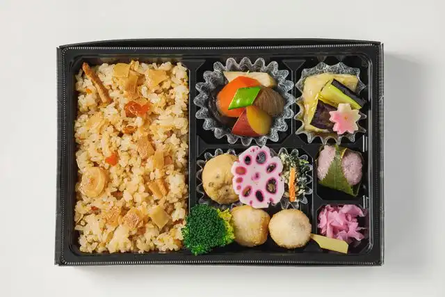 季節の炊き込みご飯220g/煮物/豆腐と茄子の揚げ出し/がんも含め煮/京風白和え/里芋串/ブロッコリー/花散らし蓮根/甘味/お漬物